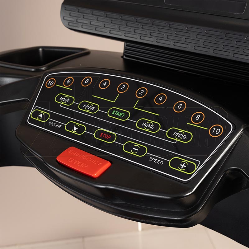 Treadmill nggunakake sabuk mlaku tanpa silikon FORBO SIEGLING berkualitas tinggi, njamin operasi sing tenang lan tahan lama. Layar 21.5-inch lan motor AC sing efisien nyedhiyakake kecepatan saka 1 nganti 20 km / jam lan miring saka 0% nganti 22%. Motor kasebut bisa tekan daya puncak 7.0HP, menehi daya sing konsisten kanggo latihan sing dawa lan kuat.